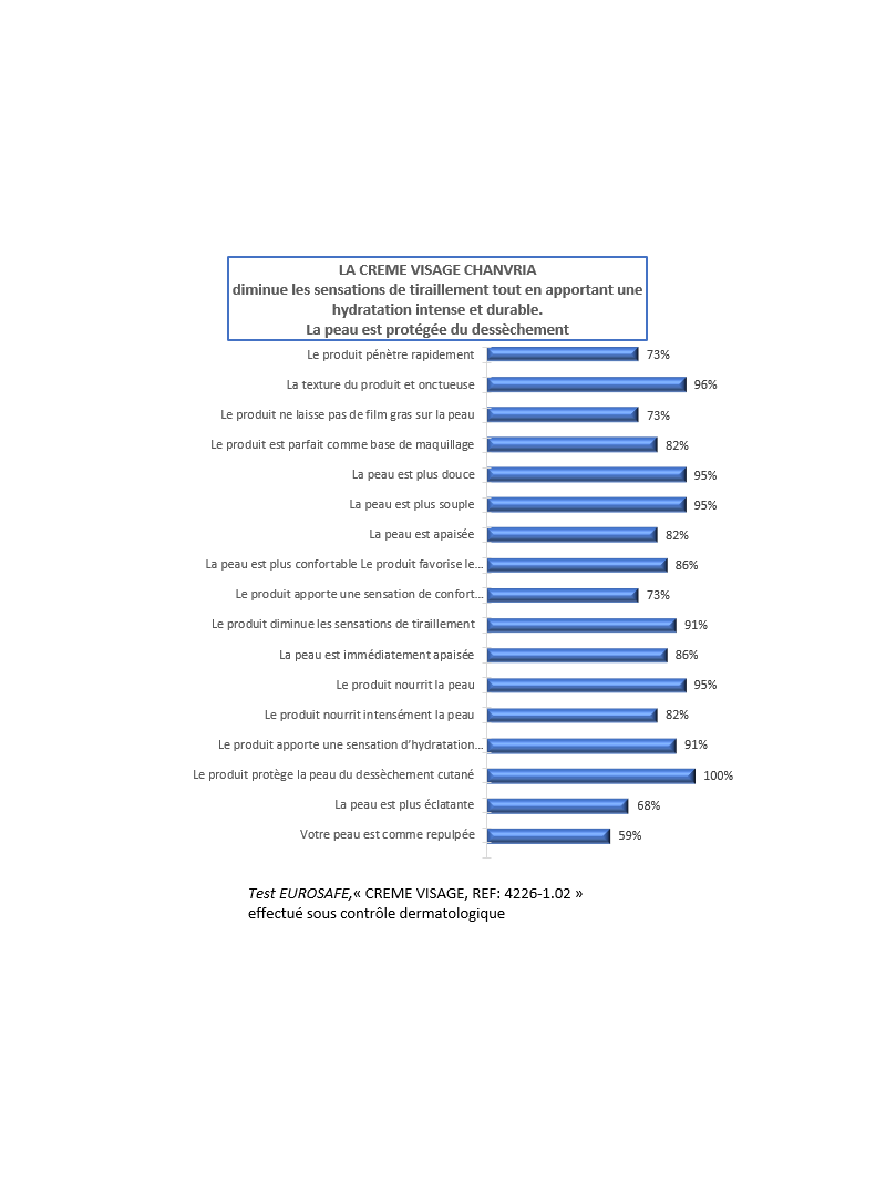 Les tests effectués sous contrôle dermatologique ont montré une totale efficacité de la crème visage CHANVRIA pour l’hydratation, la souplesse et la douceur de la peau. La crème Visage CHANVRIA apporte un effet apaisant et diminue les sensation de tiraillement.