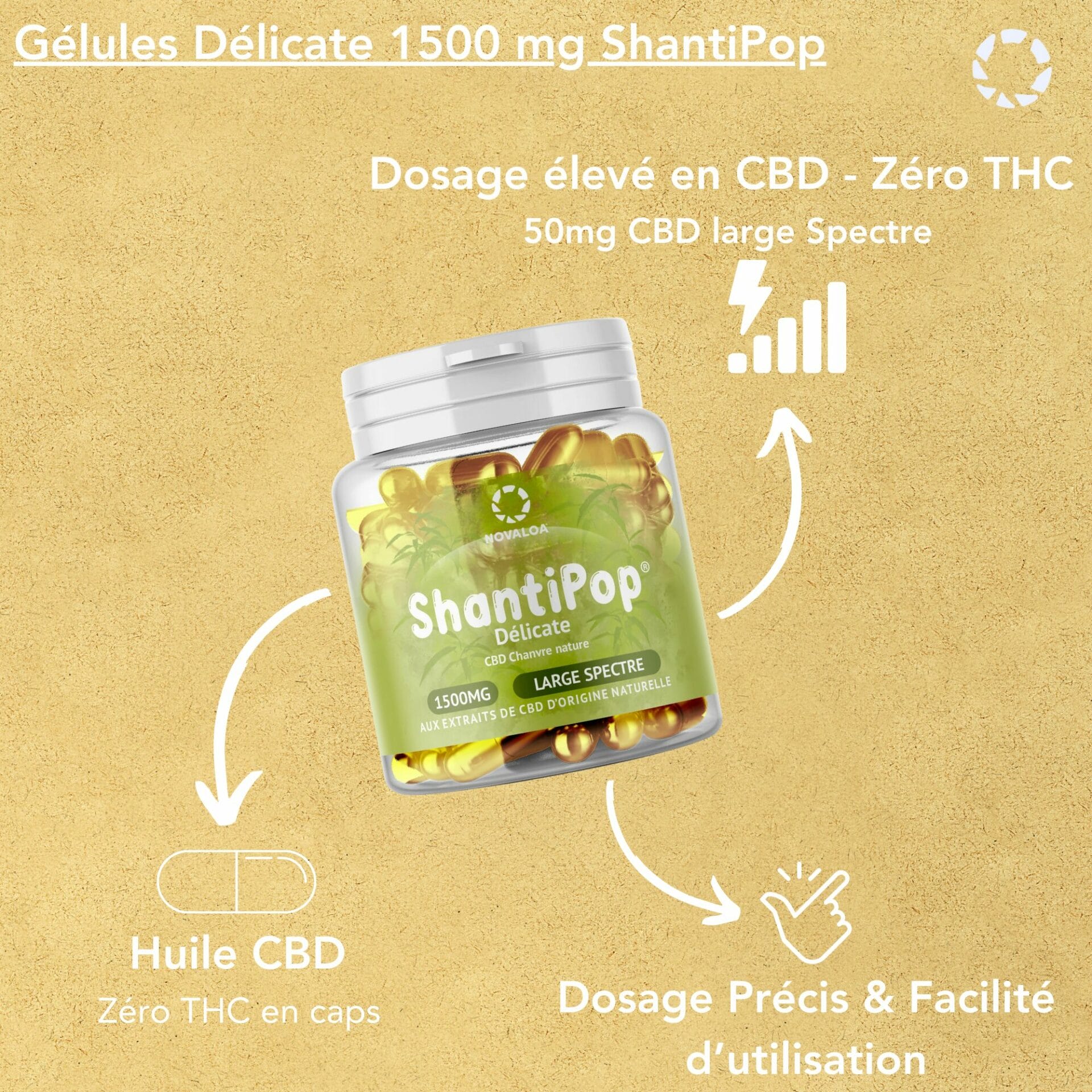 Nos Shantipop délicate contiennent chacune 50mg de CBD. Ces gélules sont une déclinaison de notre huile large spectre en version encapsulée, elles contiennent chacune 50mg CBD et zéro THC.