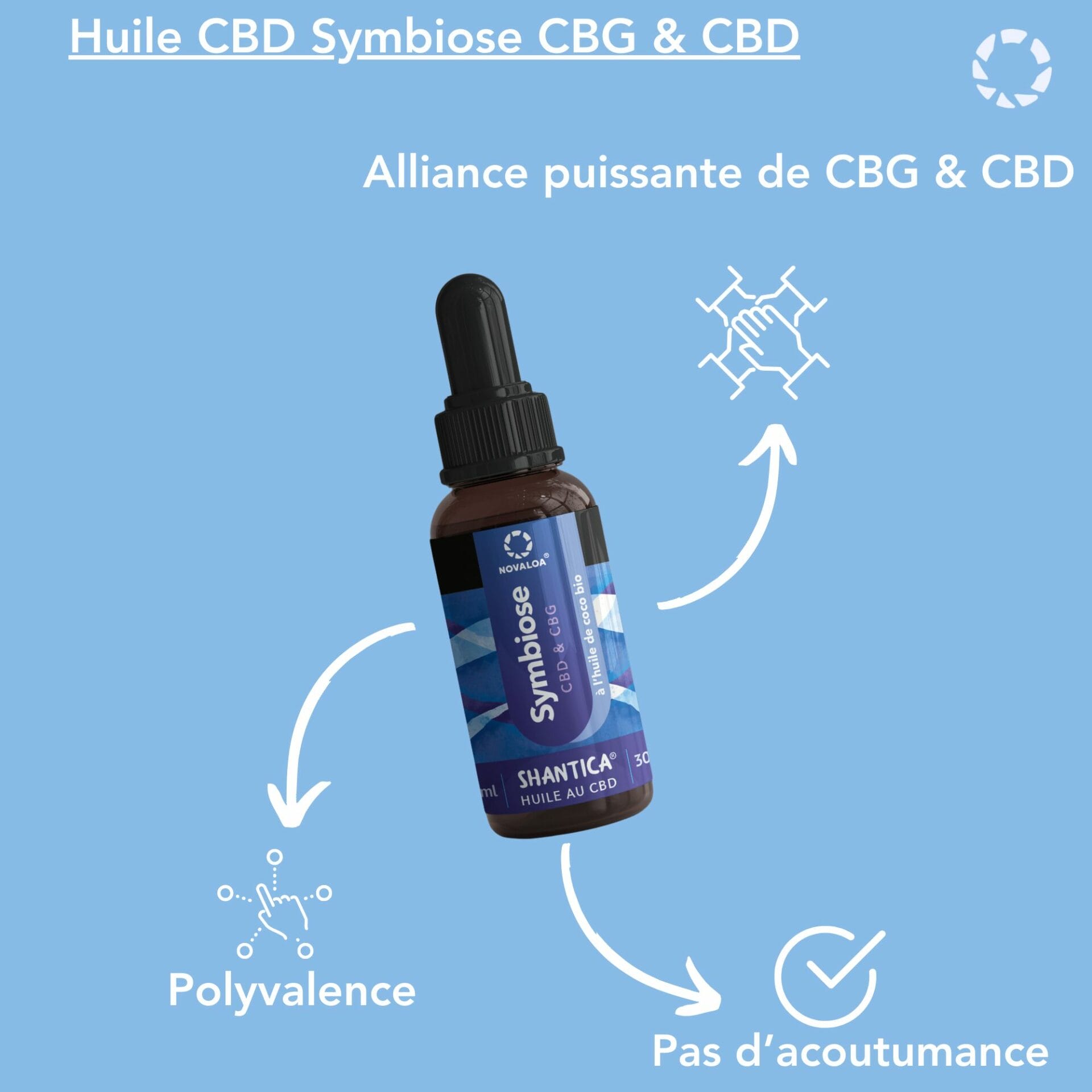 Tout d’abord, notre huile CBD & CBG “Symbiose” alliant les cannabinoides en concentration variable en CBG et CBD est une formule conçue à partir d’huile de coco biologique (MCT) et d’extraits de chanvre sans THC.